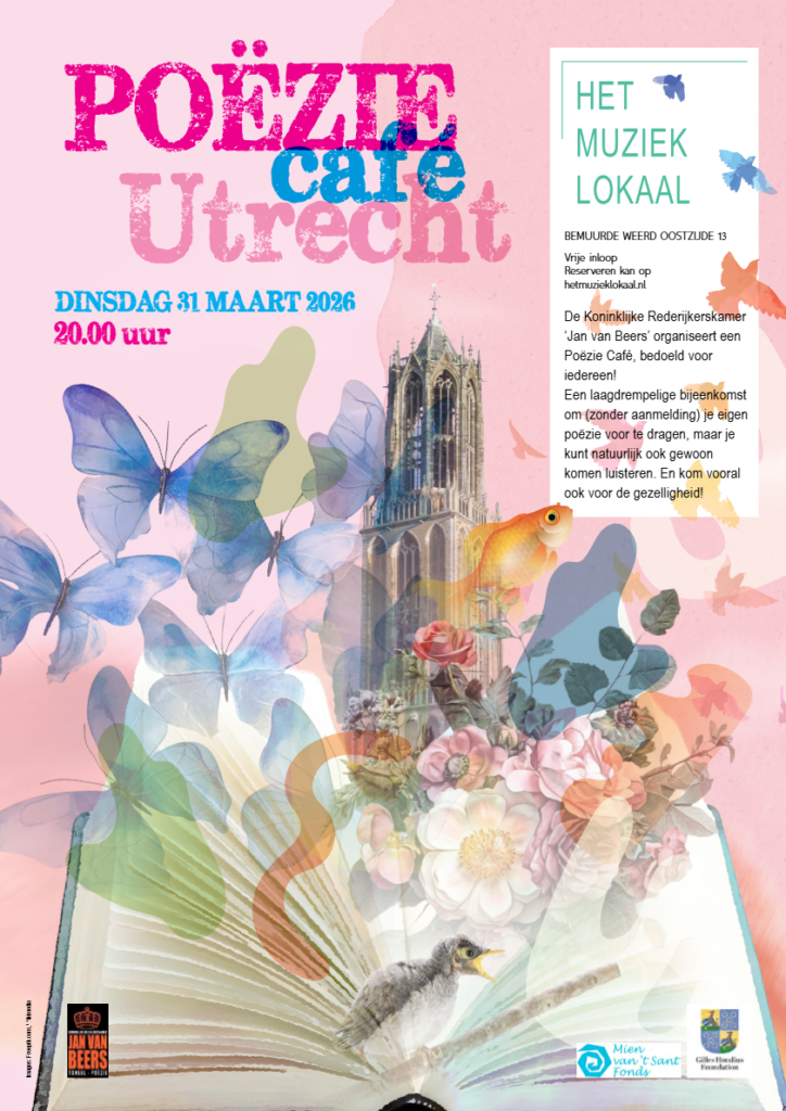 Op dinsdag 31 maart 2026 om 20:00 uur gaat het volgende Poëzie Café van start. Iedereen is van harte uitgenodigd. Als je eigen werkt hebt, voel je vrij om dat mee te nemen en daaruit voor te dragen. Maar ook als je wilt komen luisteren ben je van harte welkom in het Muzieklokaal (Bemuurde Weerd oostzijde 13). Gezellig is het altijd!